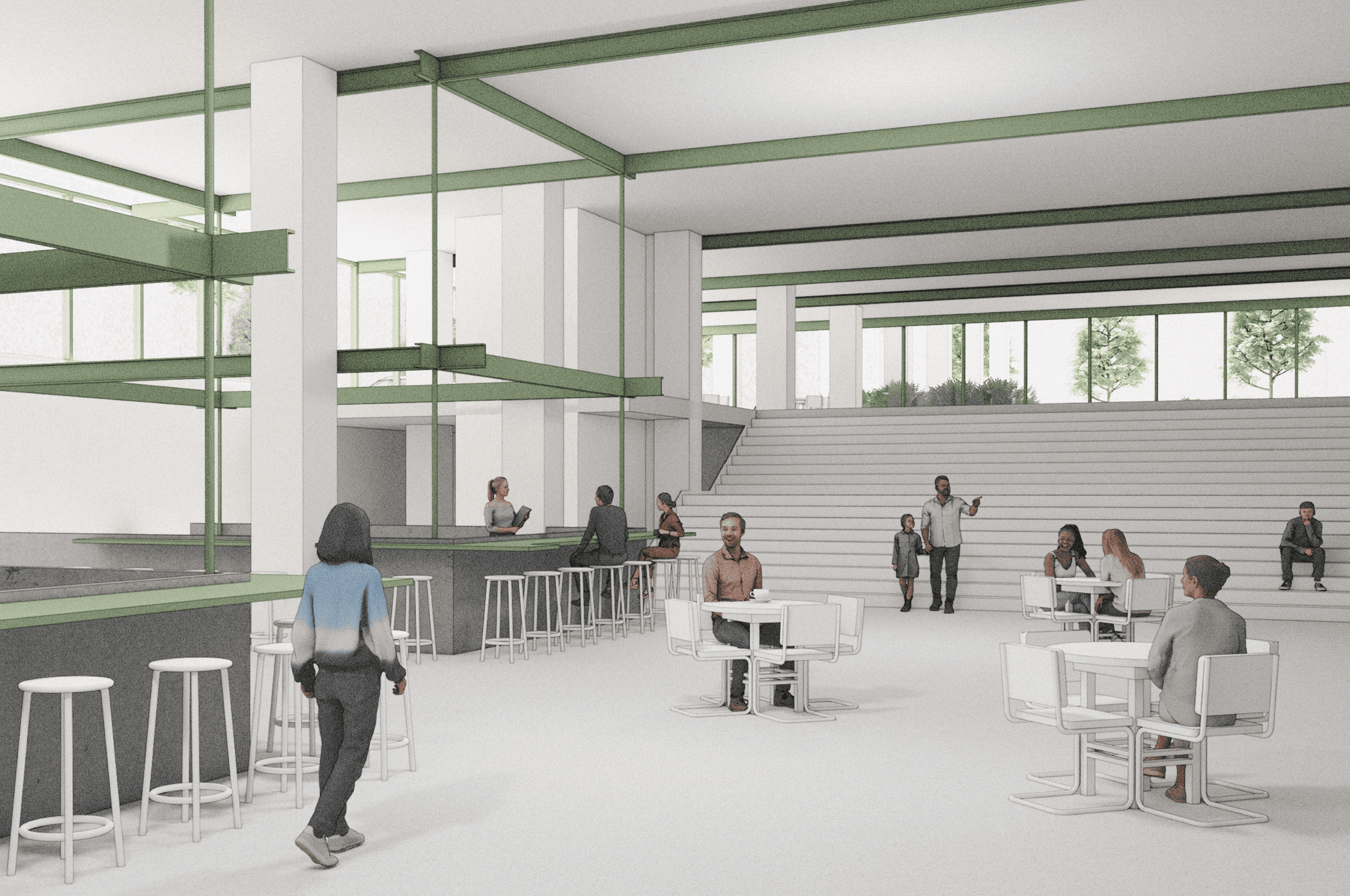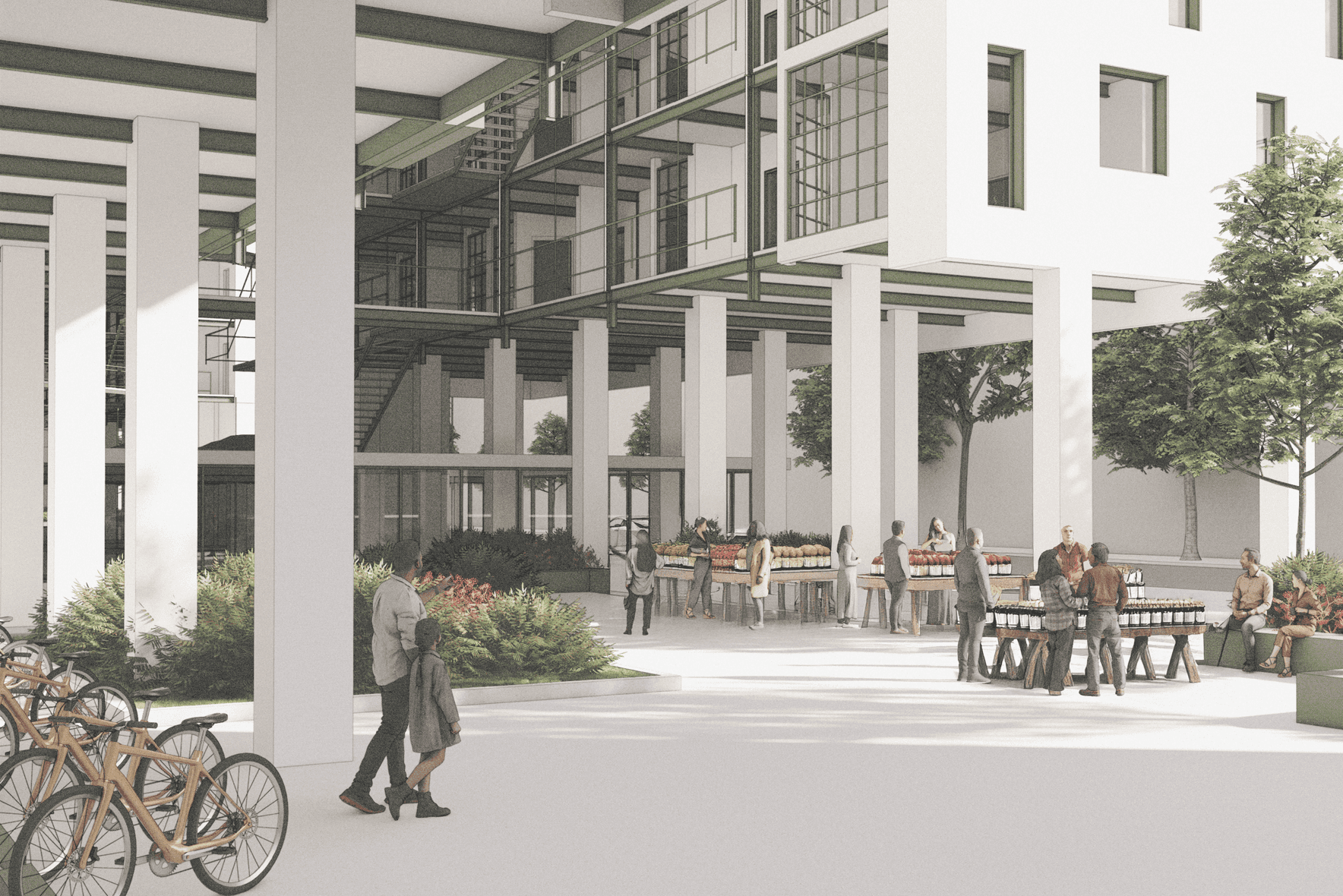 Positioned partially below-grade, it supports walkable access to fresh goods while reinforcing the local economy.