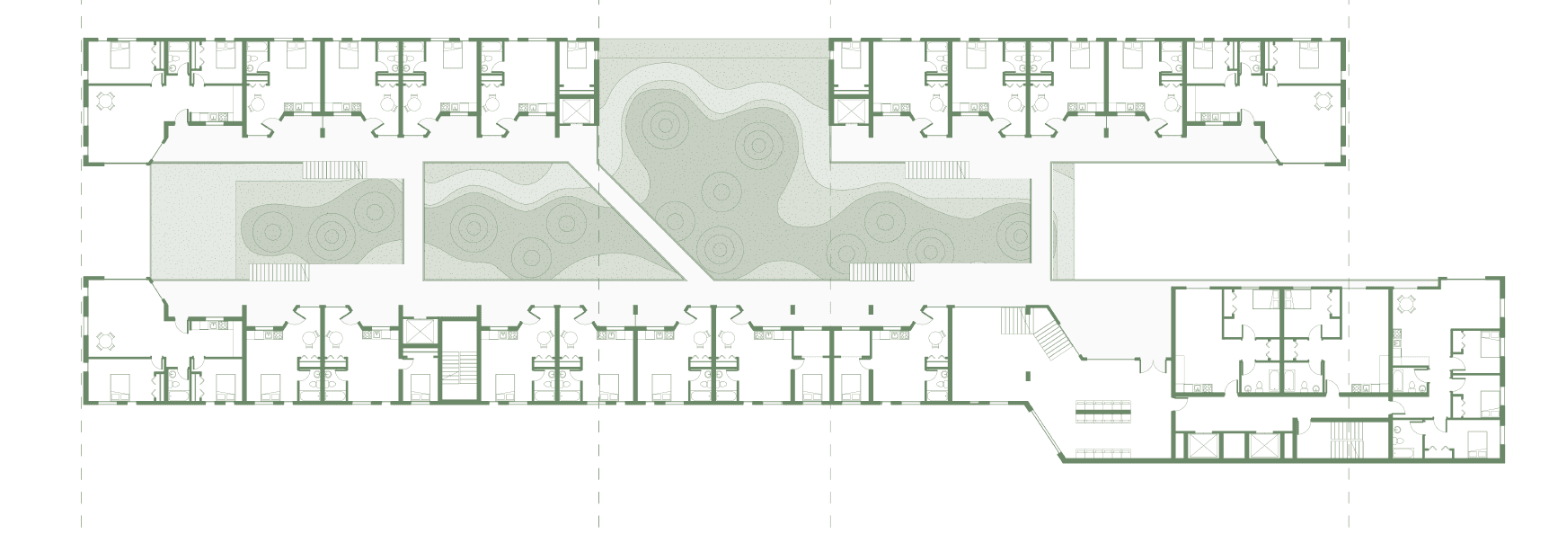 Each level is organized along long, single-loaded corridors that maximize light, ventilation, and spatial clarity. Kitchens are oriented toward the corridor, positioning everyday domestic activity as a visible and social interface rather than a private back-of-house condition. Auxiliary stairs and sky bridges extend circulation beyond the interior hall, allowing residents to move through the complex in diverse ways for social interaction.