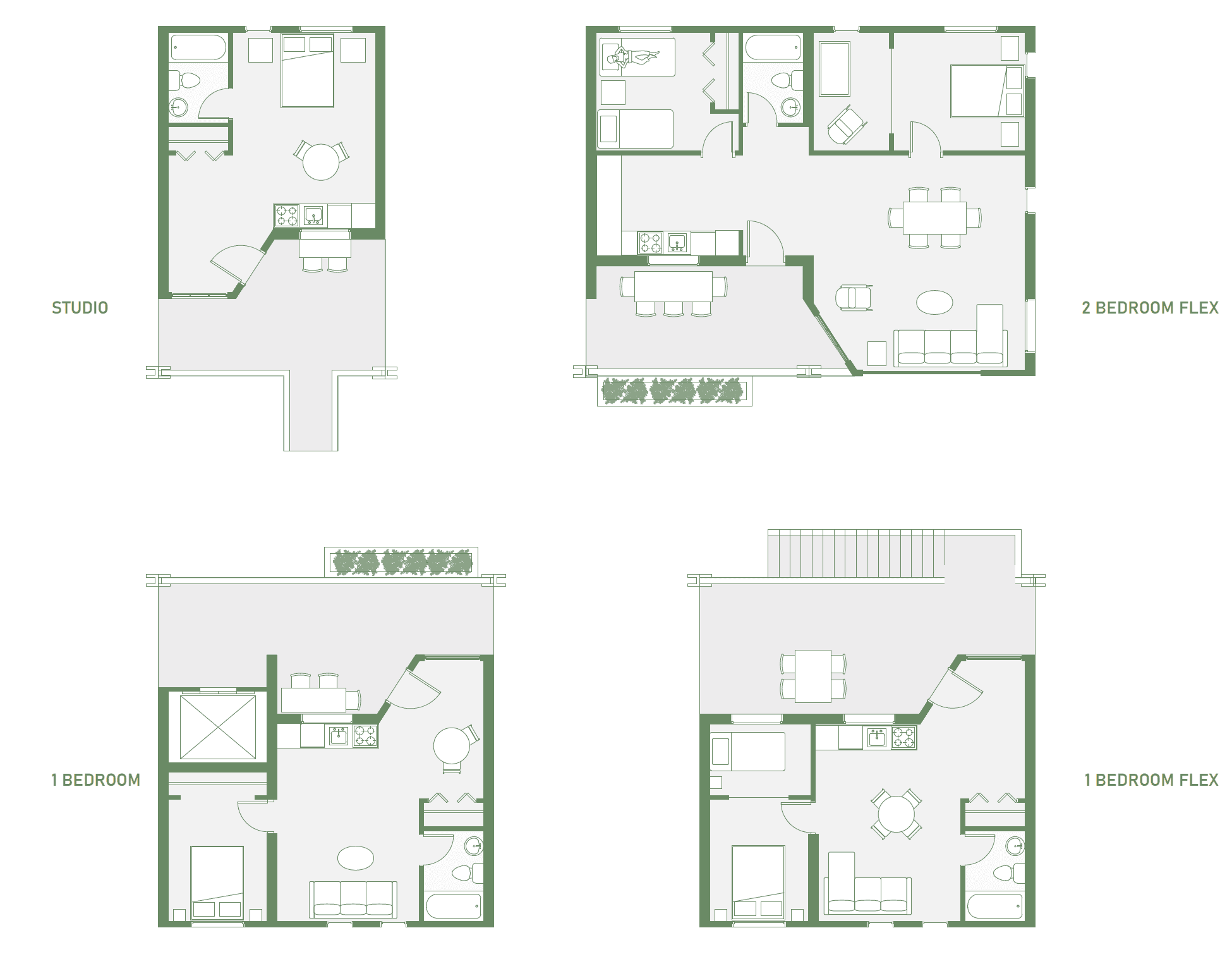 The building contains over 125 units organized across a diverse range of typologies, (studios, one-bedrooms, one-bedroom + FLEX, two-bedrooms, and a limited number of three-bedroom units). This varied mix supports multiple household structures, from the individuals to multi-generational families, within a single community framework.