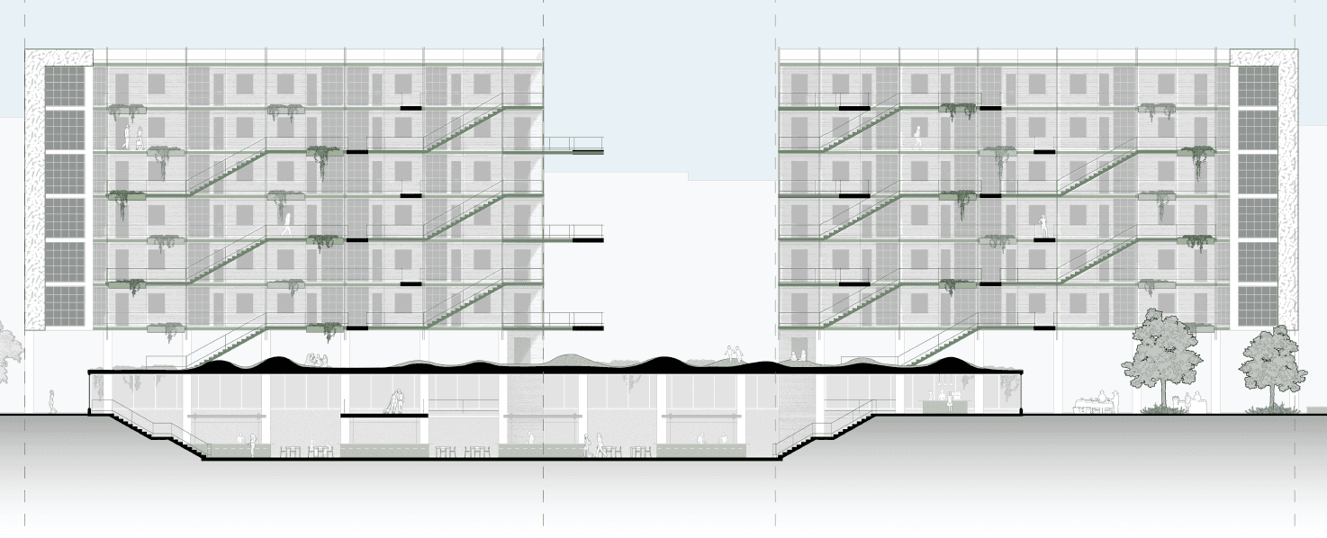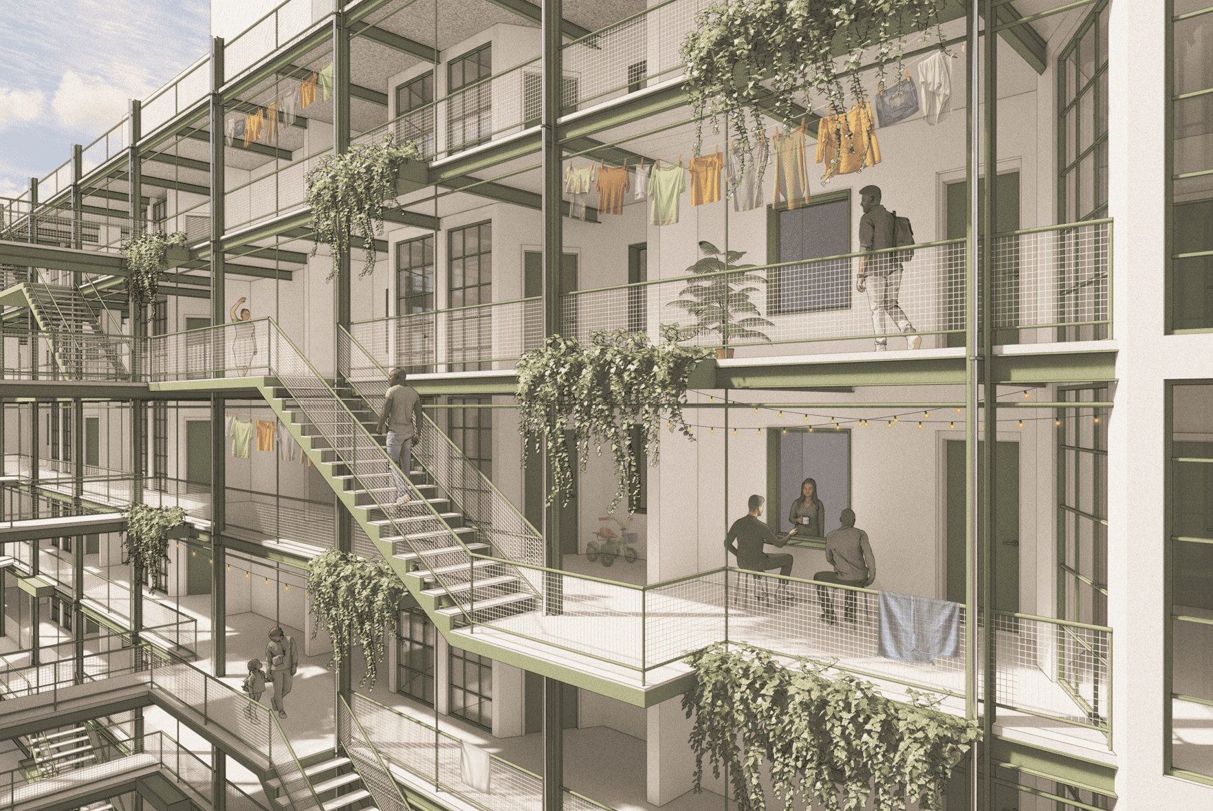 A permeable central core forms a vertical streetscape within the building. Shared outdoor kitchen spaces invite residents to gather, prepare coffee, and interact beyond their units.