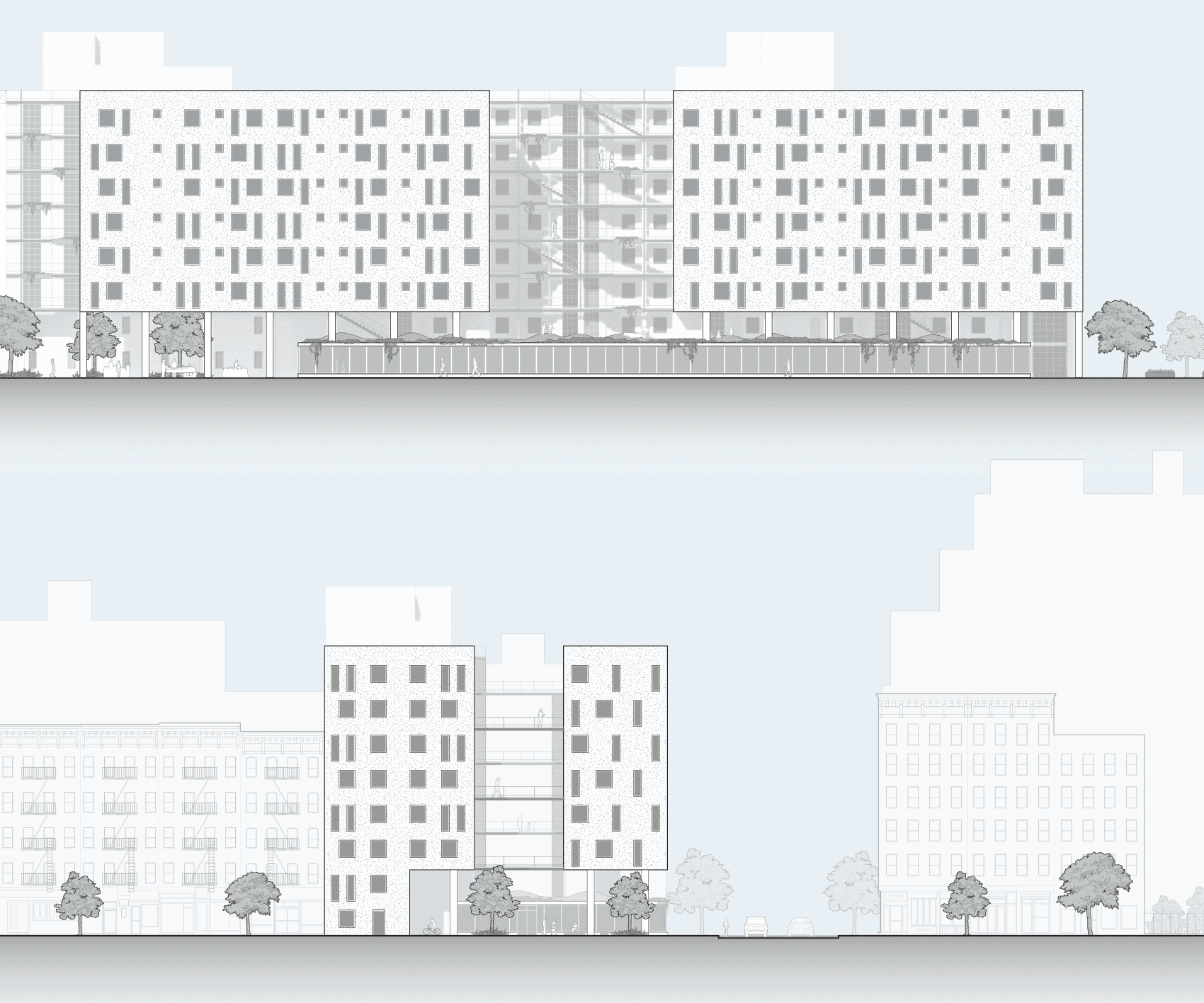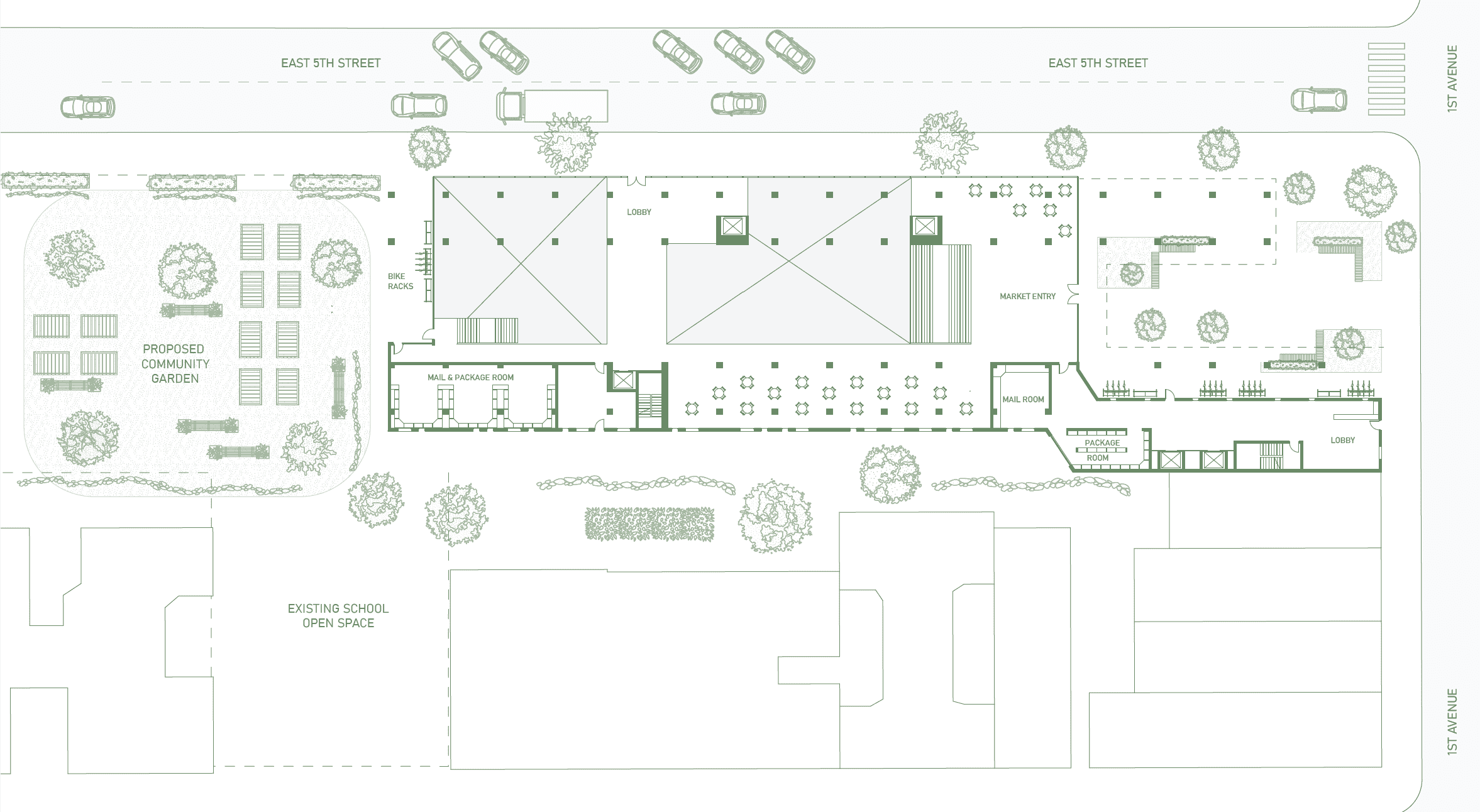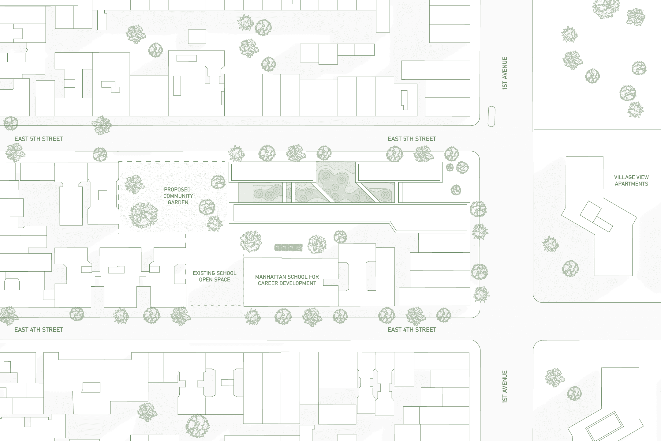 The complex occupies a narrow site in the East Village, positioned between a school, and existing Village View Apartments. By incorporating an abandoned pharmacy and adjacent residential buildings into a unified footprint, the plan reframes the community as an active part of the East Village. The result is a spatial framework that supports density while prioritizing community integration.