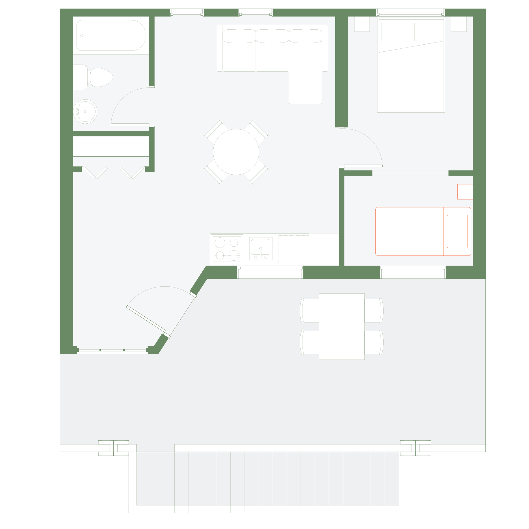 The flex space operates as an open-ended threshold capable of functioning to the needs of the occupant. This animation shows it stylized as an art studio, home office, nursery, walk-in closet, guest bedroom, or additional sleeping area. Rather than prescribing use, the intent is to support constantly changing domestic rhythms within a compact footprint.
